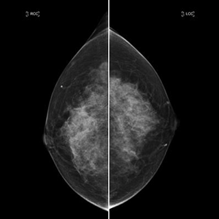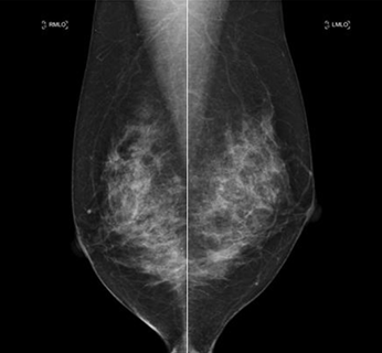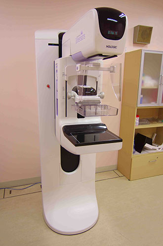 エックス線を用いた乳房撮影をマンモグラフィといいます。乳房の大部分は、乳腺を脂肪組織で構成されており、普通のエックス線検査で使用される装置では診断に有用な画像を得ることができません。マンモグラフィによって、視触診では分からない早期乳がんの発見が可能となります。