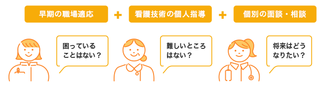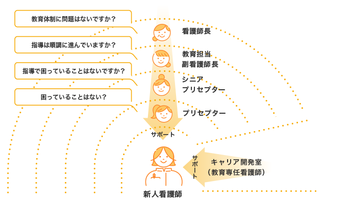 すべての新人が少しでも早く職場に慣れ安心して成長できるように、「プリセプター制度」を採用しています。成長過程で壁が訪れたとき、シニアプリセプターや教育担当副看護師長による支援により成長の殻を破れるようにします。また、教育専任者との連携によりさらなる成長を促します。