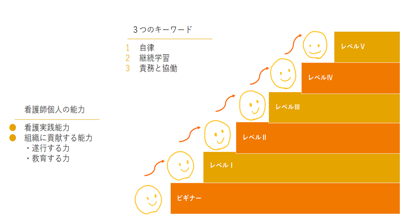 自己の課題を明確にして取り組むためのツールとしてキャリアラダーを使用しています。段階的なラダーレベル到達のため、それぞれのレベルに応じた院内研修を行っています。また、自己の課題を明確にするための支援として、看護管理者との面談(年3回)があります。