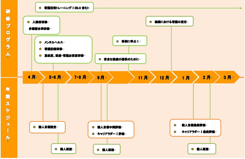 レベルⅠ到達を目指す看護師に合わせた研修や部署のサポートを受けることによって、1年目終了時には基本的な技術、知識が身につきます。