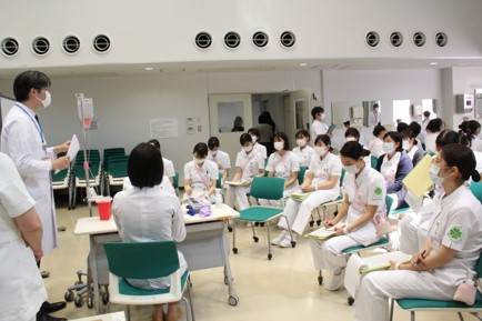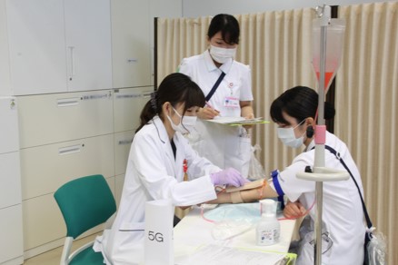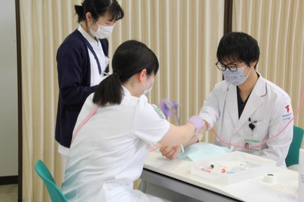 最初の1人目は緊張した面持ちながらも、患者役に丁寧に説明しシミュレーターで採血を行いました。採血針の使い方や採血方法等、指導者や観察者からコメントをもらい、一つ一つ納得しながら進めていました。1人3回採血体験を行い、最終回には手際も良くなり、患者役とのコミュニケーションもスムーズにできていました。終了後は「緊張しました」と素直な感想も聞かれ、グループでの振り返りも行い、自己の課題を認識した有意義な研修となりました。医師も患者役を経験することで、採血される時の緊張感を体感できたようでした。