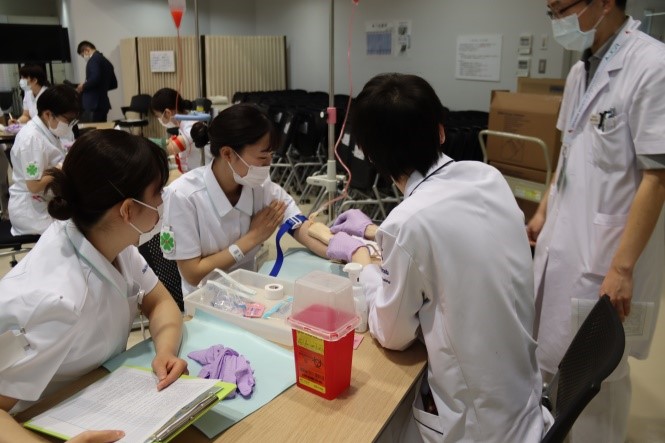 採血演習では、指導するスタッフも医師・看護師・検査技師と多職種です。模型での実施となりますが、真剣な表情で取り組んでいました。今後は各部署でトレーニングを積んでいきます。