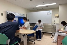 チームには病棟担当のソーシャルワーカーと看護師がいます。ソーシャルワーカーは福祉的な視点、看護師は医療的な視点から患者さんの意向を踏まえ、協力して転帰先(転院・自宅など)でその人らしい生活が送れるように支援を行っています。また、必要な人に早期に支援が開始できるように、新入院の患者の情報収集を行い病棟での入退院支援カンファレンスに参加しています。退院後に訪問看護や訪問診療などが必要になる場合は、退院前カンファレンスにも参加しています。