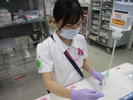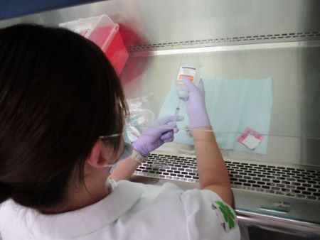 安全キャビネットで注意を払って薬剤を混合するミキシングができるようになりました。