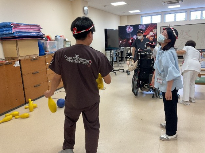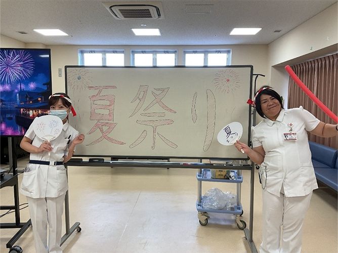 看護師が企画・準備を行い、患者さんに季節を感じ、楽しい時間を過ごしていただけるようにと、例年実施しています。当日は、お祭りのBGMが流れる中、楽しい雰囲気に包まれました。ヨーヨー釣りや輪投げ、おもちゃの魚釣りなどのゲームを楽しみ、特にヨーヨー釣りでは、自分で釣りあげたヨーヨーをお土産として持ち帰ることができたため、患者さんたちに大変好評でした。最後には部屋を暗くし、花火大会の映像を鑑賞しました。医師はじめ多職種のスタッフも参加し、患者さんとともに楽しい時間を過ごすことができました。