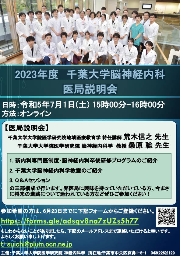 ◆ 詳細は、ご案内ポスターをご覧ください。 2023年度 千葉大学脳神経内科 医局説明会ポスター