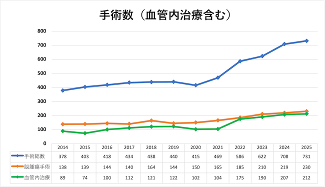 最近10年間の千葉大学病院脳神経外科での手術総数は、毎年右肩上がりで増加しています(下図)。2020年および2021年は、Covid-19/新型コロナウイルス感染症の対応のため、手術ができない期間が約1ヶ月間ありましたが、その後は、年を追うごとに手術件数は増加し続け、2025年は年間731件(前年比+23件)の手術が行われました。
