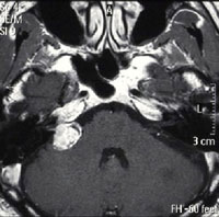 聴神経腫瘍を診断するためにはMRI(エムアールアイ)が必須です。造影剤を使ったMRIを行うことにより、直径数ミリの小さな腫瘍を正確に診断することができます。聴神経腫瘍が大きくなった場合は、CTによっても診断することは困難ではありませんが、CTでは数mmの小さな聴神経腫瘍を診断することは通常不可能です。聴力検査など耳鼻科での検査も必要ですが、聴神経腫瘍を最終的に診断するには、MRIあるいはCTという画像診断が必要です(図1)。