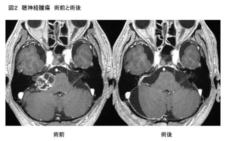 腫瘍が大きい場合(おおよそ3cm以上)では、小脳・脳幹の圧迫があり、手術による摘出術が基本です。腫瘍が小さい場合(1~2cm程度)では、ガンマナイフ治療による治療も選択枝としてあげられます。腫瘍がさらに小さい場合は、症状が明らかではない場合もあり、MRIにより半年から1年に1回程度の経過観察を行い、様子をみることがあります。
