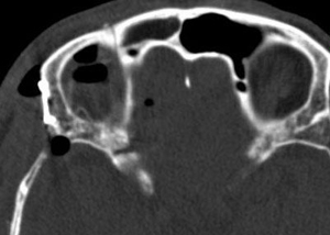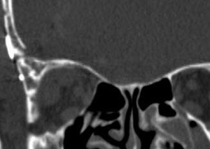 眼窩は、頭蓋骨と顔面骨により形成される四角錐型のくぼみで、視神経管と上眼窩裂を通して頭蓋腔とつながっています。上壁は頭蓋腔と、内側壁‐下壁は副鼻腔(篩骨洞・上顎洞)と、外側壁は眼窩外と接しています。眼窩内には眼球、外眼筋、各種神経とその鞘、涙腺、脂肪等の組織が含まれ、それぞれの組織から良性あるいは悪性腫瘍が発生します。また、隣接する副鼻腔や頭蓋内に発生した腫瘍が眼窩内に進展することもあります。