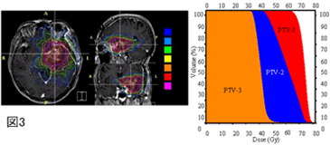 一方、IMRTのもう一つの特徴として、同時に異なる線量分布を作成できるSimultaneous Integrated Boostという照射法をあげることができます。例えば、腫瘍本体に強く照射を行い、その周囲に柔らかく照射を行うといったことが自由にできるのです(図3)。この照射法は特に浸潤性腫瘍において有効と思われ、千葉県がんセンターでは2002年から神経膠腫の治療にIMRTを応用し、優れた治療効果を証明しています。