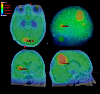 IMRTは、①不正形腫瘍に対する対応が可能、②Simultaneous Integrated Boost法が可能、③分割照射が可能、などの点で、従来の照射やガンマナイフに代表される定位照射に比較してより自由度の高い優れた照射法ということができ、千葉県がんセンターでは全国に先駆けて神経膠芽腫治療への応用を行って参りました。(IMRTの項を参照)