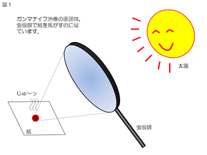 ①定位的放射線外科治療(ガンマナイフ治療の項目を参照してください)ガンマナイフに代表されるこの治療は、転移性脳腫瘍の治療に大きな変化をもたらせました。ガンマナイフ治療を例に説明します。約200個のコバルトから照射される放射線を1カ所に集中させて、転移巣に1回高線量の放射線を照射する方法です。原理は虫眼鏡で太陽の光を1点に集めて紙を焦がしたことのある方は、思い出していただくと理解しやすいと思います(図1)。治療できる腫瘍の大きさはおおよそ2.5cm程度までとされています。剃毛は不要で、頭部に局所麻酔でフレームを固定し、MRIを撮影して転移巣の位置を決定して正確に放射線を照射します。照射する放射線のエネルギー(辺縁線量)は18-22Gy(グレイ)程度です。治療に必要な時間は、転移巣の大きさ、個数により異なりますが1から2時間程度です。通常2泊3日程度の入院で治療は完了します。治療後は、治療巣の再発、周囲の脳のむくみや新しく出てきた病変をMRIで定期的に調べていきます。約3割の方で、新しい病変に対して再度治療が必要となります。