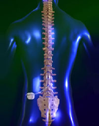 脊髄には痛みをコントロールする関門があるという説に基づいて,脊髄に電気刺激を行います.そうすることで痛みが脳に伝わりにくくなり,痛みがやわらぎます.脊髄に電気刺激を行うために,ペースメーカーの応用技術で開発された機器を体内に植込みます.この治療は痛みの原因を除去するものではなく,痛みの感覚を刺激感(しびれ)に置き換えて痛みを軽減させる治療法です.