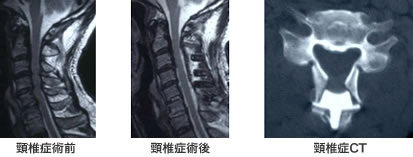 手術は、前方からもしくは後方から行います。いずれから行うかは、病変部分がどこにあるかにより決まります。左図は、後方より椎弓形成術を行った頸 椎症の術前MRIです。中図は頸椎症の術後MRIです。脊髄神経が十分に除圧されています。右図は術後CTです。観音開きにされて、セラミック製の人工の 骨をはさんで、脊柱管を拡大しております。
