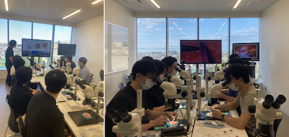 卓上顕微鏡と人工血管を用いて、バイパス手術のハンズオンを