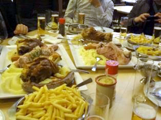ある日の夕食@ドイツ料理店。日々この肉の塊を食べている方々相手に、我々日本人がまともにサッカーの試合をしても勝てるわけないな、と痛切に思いました。