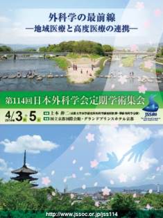 外科学会総会14 4月3日~5日の3日間、京都大学肝胆膵・移植外科の上本伸二先生を会頭として、第114回日本外科学会定期学術集会が、国立京都国際会館、グランドプリンスホテル京都で開催されました。外科学会総会は、我々外科医が参加する学会の中では国内で最も規模が大きいもので、循環器、呼吸器、消化器、救急、小児などの幅広い分野で発表と討論が行われます。すそ野が広いために若干総論的な内容となることは否めませんが、普段かかわる機会がない他の外科学領域の最新の知識を得ることができるチャンスでもあります。