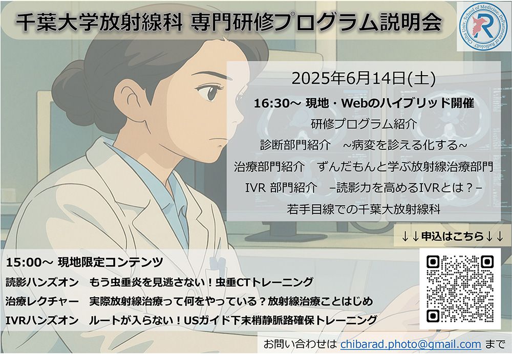 放射線科を考えている方、他の科や医局と迷っている方はもちろん、まだ進路を決めていない初期研修医1年目や学生の方も気軽にご参加下さい。