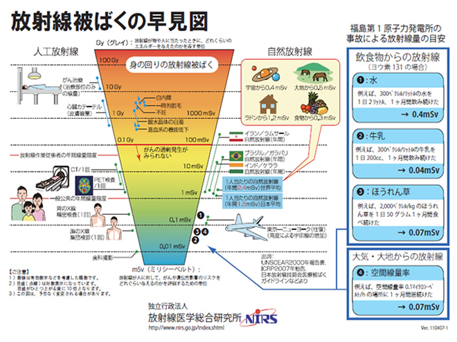 これらにより、異なる放射線の種類や放射線を被ばくした部位によらず、その影響を評価できます。mSv(ミリシベールト)は、Svの1/1000の値で、1Sv=1000 mSvとなります。