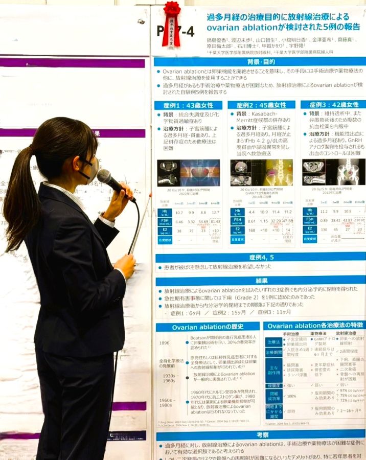 当科の鍋島先生が優秀教育展示賞を受賞されました。演題名は「過多月経の治療目的に放射線治療によるovarian ablationが検討された5例の報告」で、手術治療や薬物療法が困難な過多月経症例に対して、放射線治療により内分泌学的閉経を達成した自験例を報告しました。