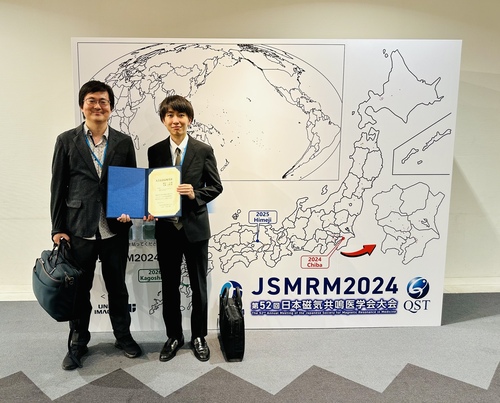 当科からは橘川先生、恒田先生が講演、藤本先生、堀越先生、横田が座長を務めました。また、学生の佐藤宗暁くんと横田が行った研究『Diffusion-relaxation matrix (DRM)を用いた 脳梗塞の発症後時間推定』が、大会長賞(最優秀賞)に選ばれました。