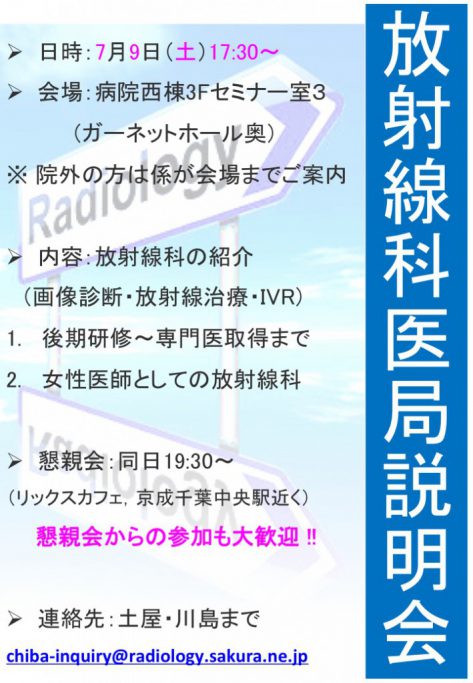 去る2016年7月9日に千葉大学放射線科の医局説明会が開催されました。説明会には6年生を含め、13名もの先生方が参加してくれました。中には遠方からいらしてくださった先生もいらっしゃいました。この場をお借りして御礼申し上げます。本当に有り難う御座いました。