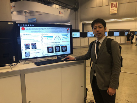 モントリオールで開かれたISMRM(International Society for Magnetic Resonance in Medicine)に、窪田・横田で参加して参りました。今年は、国内留学させて頂いた京都府立医科大学放射線科の山田惠先生がfellowに選出され、記念となる会でした。当科からは、窪田先生がsingle shop法と広いIR pulseを利用した高速撮像FLAIRの、急性期脳梗塞患者に対する有用性について発表を行いました。Radial scanでも抑えることができないmotion artifactさえも抑制できる高速撮像法で、東千葉メディカルセンターの坂井技師との共同研究の結果です。窪田先生は初めての海外学会発表でしたが、発表端末に来た参加者に的確に答えていました。彼なりに今後発表する際にはこうした方がよいのでは…というコツを掴んだようなので、ますますの活躍に期待です。