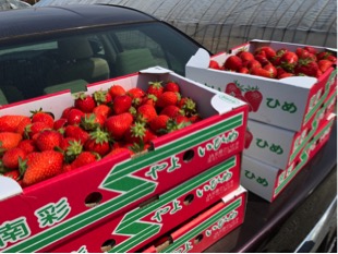 ビニールハウスの中には、立派なイチゴが溢れんばかりに実っておりました。練乳も用意して頂いておりましたが、イチゴ自体が非常に甘くそのままで楽しんでしまいました。お腹いっぱいイチゴを頂いた後は、なんとダンボールに好きなだけ詰めて良いとの事!こんな機会は滅多に無いと思いながら山盛りのイチゴを頂きました。