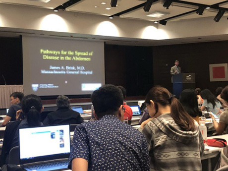 会場では1クラス40人程度に分けられ、USBで参加者に配布された画像をときに参照しながら、壇上で講師がスライドを用いて講義を行う形式でセミナーが進んでいきました。Interactive lectureという触れ込みであったので、英語が苦手な私は意見を求められないか戦々恐々としていましたが、その点は杞憂に終わりました(いつまでもこんなことではいけませんね)。ただ、決して狭くはない会場にも関わらず、マイクも用いずに受講者から講師に質問が投げかけられる場面も多々ありました。日本語でも同じことをするのは私には難しく、分化の違いを感じます。