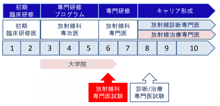 放射線科の専門医制度は二段階になっています。2年間の初期研修修了後、卒後3年目を迎える先生方は、まず「放射線科専攻医(=従来の後期研修医)」として放射線科全般に関する専門研修をスタートします。画像診断、核医学、放射線治療に関して3年間幅広く専門研修を行い、第一段階である「放射線科専門医」受験資格を取得します。