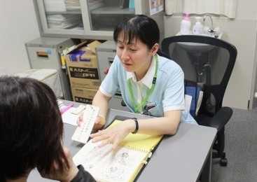 訓練風景です。紙面での文字や絵などを使いながら高次脳機能訓練を行っています。言語聴覚療法室は閉鎖空間であり担当セラピストと患者さんが一対一で行うため訓練に集中しやすい環境になっています。