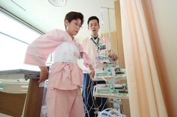 手術後に病棟にてリハビリをしている様子です。術後早期よりリハビリを開始し、臥床に伴う筋力低下及び呼吸器の合併症などの予防に努めています。