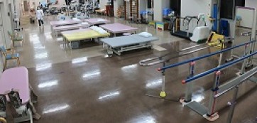 理学療法室の風景です。理学療法室では様々な治療を受けられている方が病室より来室されリハビリを受けられています。