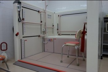 OT室内の訓練用の浴槽です。実際の洗体動作の方法や浴槽の跨ぎ動作の方法を練習します。患者さんごとに安全・安楽な方法などを一緒に考えお伝えしていきます。