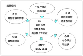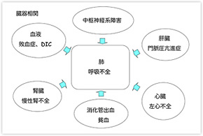 呼吸器病態が悪化、進行すると呼吸不全に陥ります。これには急性と慢性がありますが、呼吸不全では臓器相関が問題になります。呼吸不全は中枢神経系、血液系、腎臓、消化管、心臓、肝臓など多くの他臓器に影響を及ぼします(図4)。また、その逆の場合もありえます(図5)。