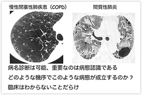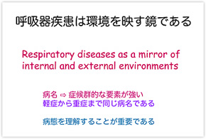 呼吸器疾患は環境を映す鏡である、と言われています。病気は何からの未知の遺伝的素因の上に環境要因が加わって成立する場合が多いのが実際です。病名は症候学的な要素が強く、軽症から重症まで同じ病名で理解されがちです。しかし、軽症と重症では同じ病気でも病態は異なり、治療戦略は異なるべきです。すなわち、病名診断は重要ですが、病態の理解はさらに重要になります(図6)。