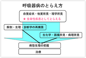 呼吸器病学では、解剖学、生理学、診断学を再構築し、生化学的所見、画像所見、病理所見を加えて、総合的に全身性疾患としての病態生理の把握が必要です。それが適切な治療に繋がります(図7)。