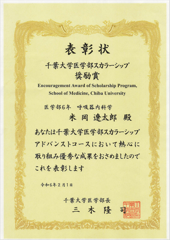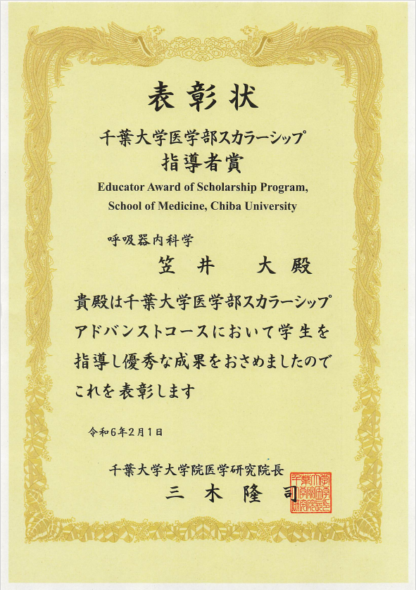医学部6年生米岡遼太郎さんが千葉大学医学部スカラーシップアドバンスコースにおいて優秀な成果をおさめ奨励賞を受賞、笠井大講師がその指導に尽力したことで指導者賞を受賞しました。