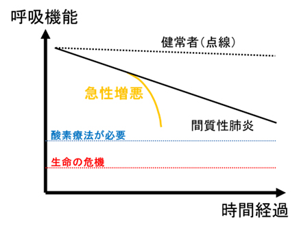 急性増悪によって呼吸機能が一段階低下する可能性があります。速やかな対応(酸素やステロイド薬などの投与)を行わないと命に関わる事態になることがあるので注意が必要です。