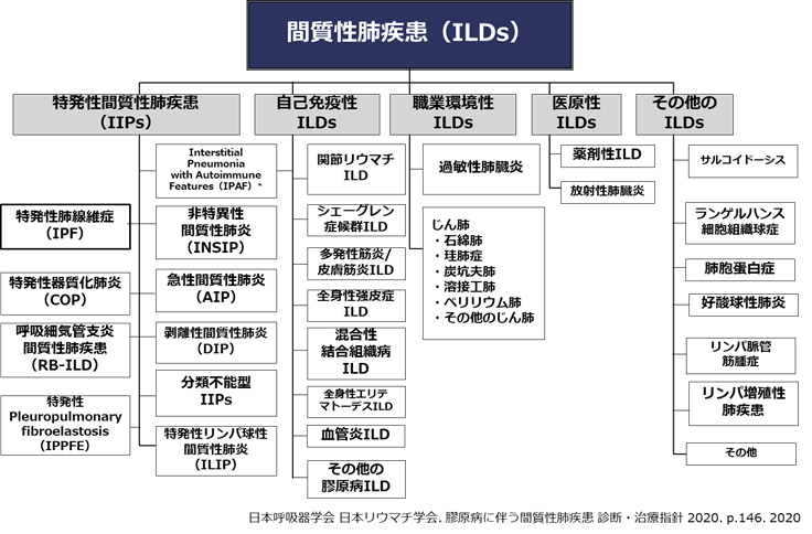 間質性肺炎(間質性肺疾患)の分類としてガイドラインには以下のようなさまざまな病気が挙げられています。これをみてわかることは、間質性肺炎には多くの病気が含まれているということです。