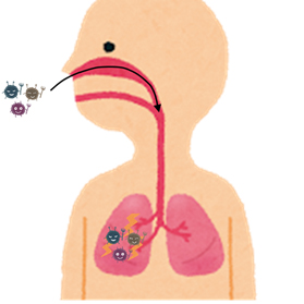 一般的に肺炎と言うと「細菌性肺炎」のことを指します。口や鼻から入った細菌が気管支や肺胞の中で増殖すると、それに対抗するため自分自身の免疫細胞が攻撃します。その攻撃の影響は侵入した細菌だけではなく、周囲の正常な組織にも及びます。これを「炎症」と呼びます。「細菌」による「肺」における「炎症」、これが「細菌性肺炎」です。