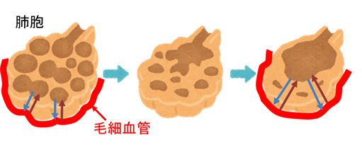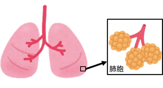 肺は鼻や口から吸った空気の中に含まれる酸素を血液へと取り込み、不要となった二酸化炭素を体の外に出す働きをする臓器です。吸った空気は、肺の一番奥にある「肺胞」という場所に運ばれ、肺胞を取り囲むように流れる毛細血管との間で酸素・二酸化炭素のやり取り(ガス交換)をしています。