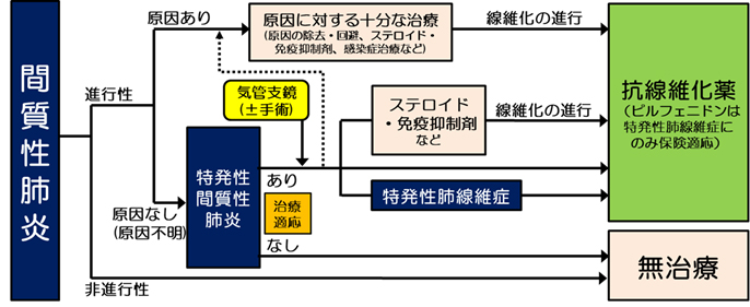 原因が特定できない特発性間質性肺炎は、病理組織学的な立場からさらに細かく分類されています。それにより治療法が異なりますので治療にあたっては正確な診断をつけることが重要です。臨床経過や血液検査、レントゲン・CT検査の所見、気管支鏡や手術による細胞検査・組織検査によって、治療法を決定します。特発性間質性肺炎のうち「特発性肺線維症」であれば抗線維化薬(ピルフェニドン、ニンテダニブ)が第一選択となります。それ以外の特発性間質性肺炎に対しては各種検査結果に応じて抗炎症薬(ステロイド、免疫抑制剤)か抗線維化薬か(場合によっては両者の併用)を選択します。間質性肺炎は一度進行すると不可逆性であることが多いため早期の治療が望まれます。しかし中には、無治療によっても病状が進行しないものもありますので、全ての患者さんで治療を必要とするわけではありません。また、治療薬はいずれも副作用があり、費用も高いため、治療の選択は現在の年齢、元気さ、他の臓器の状態、病状の進行具合、各種検査結果、副作用などを勘案して総合的に決定します。