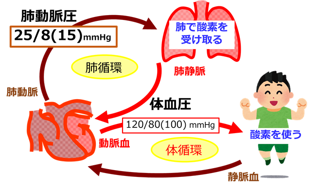 肺動脈へ血液を送り出す力の源は「右心室」の収縮期圧です。肺動脈収縮期圧は右室駆出期圧と等しく、肺動脈拡張期圧は肺動脈弁の閉鎖により保たれ、つねに肺への血流を維持する仕組みになっています. 安静時平均肺動脈圧の正常値は 15mmHg以下とされ、血圧計で測定可能な「体血圧」と比べると低い圧力でコントロールされています (新・心臓カテーテル検査(改訂第2版) 1990年, 南光堂).