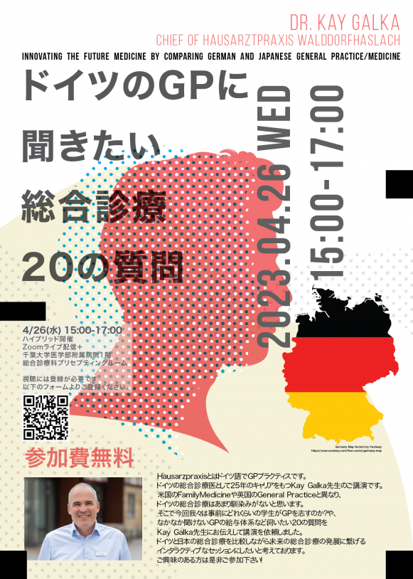 4/26(水)にドイツよりGP (General Practitioner, 総合診療医)であるKay Galka先生を招いて、日本とドイツの総合診療の比較と総合診療の未来への提言についての講演を行います。
