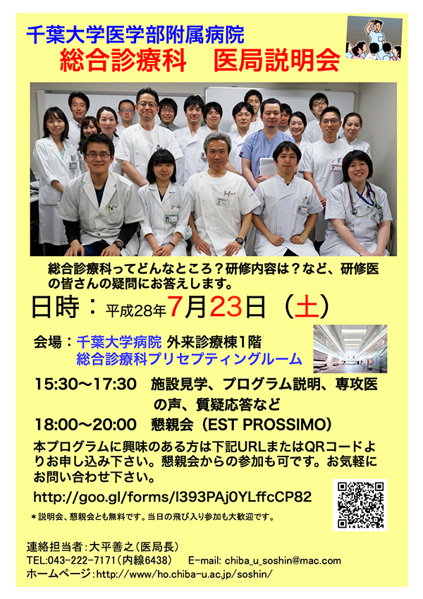 総合診療科ってどんなところ?研修内容は?など、研修医の皆さんの疑問にお答えします。平成29年度に専攻医研修を開始する方が対象ですが、学生さん、初期研修医1年目で当科に興味のある方の参加も歓迎します。説明会の後は、当科スタッフ、専攻医との交流を目的とした懇親会を行います。当科での専攻医研修に興味のある方は、是非、ご参加下さい。
