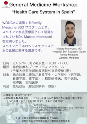 - 内容:当日はDr. Matteoをお招きし、スペインにおけるヘルスケアシステムに関する御紹介を頂きながら、参加者全員で日本との相違点について考察し、地域医療に関するグローバルな視点を深めることを目標としています。皆様奮って御参加下さい。