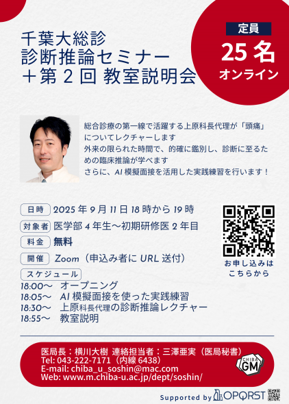 外来の限られた時間で、的確な診断を行うための診断推論から、患者マネジメントに至るまでを学べるwebセミナーです。実践的なAI模擬面接を活用し、その場で指導医からフィードバックも受けられます! 総合診療の第一線で活躍する上原科長代理による全体フィードバックとレクチャーも実施します。