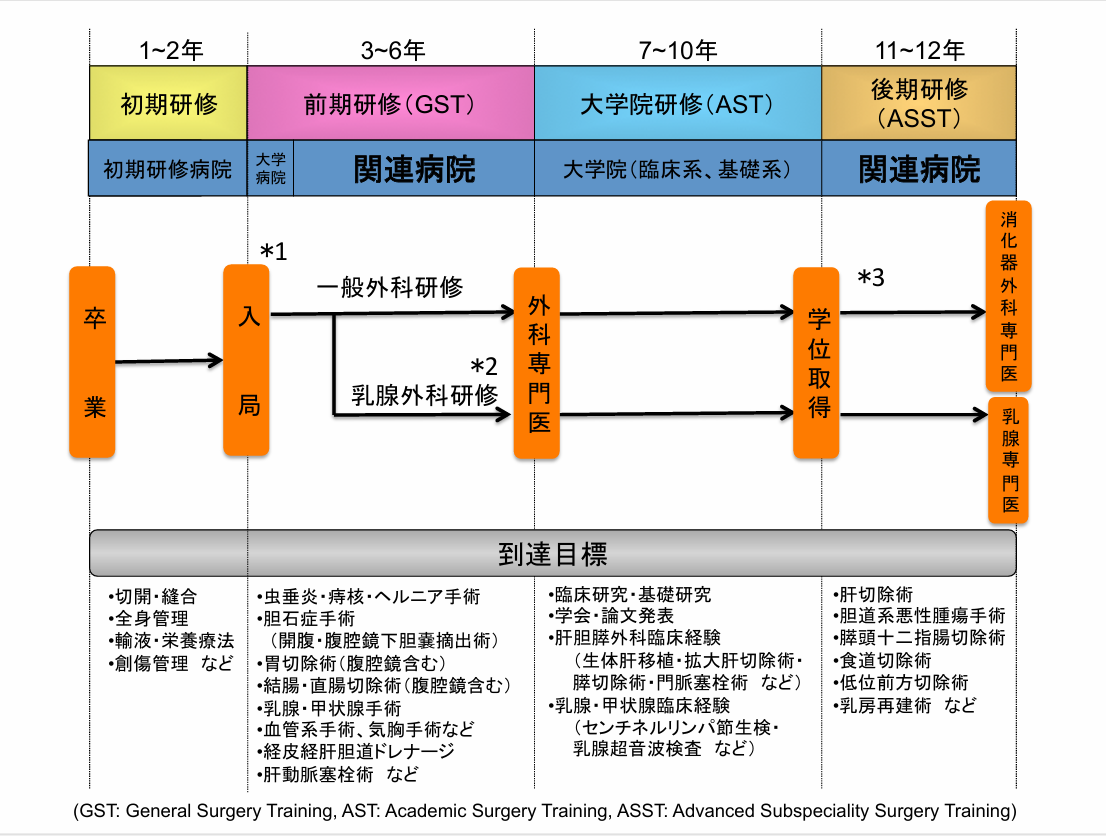 *2 乳腺外科志望の先生は,必要十分な一般外科研修(目安としては外科専門医取得に必要な症例経験が得られる関連病院での研修1年目程度)の終了後には,関連病院での乳腺外科専門研修を選択することもできます.